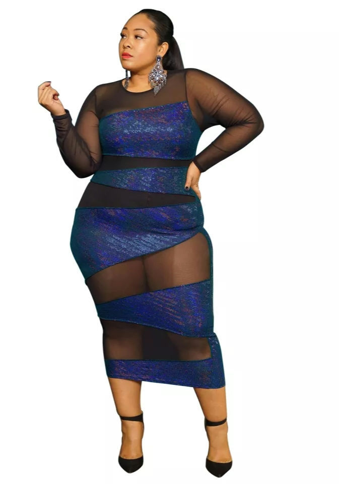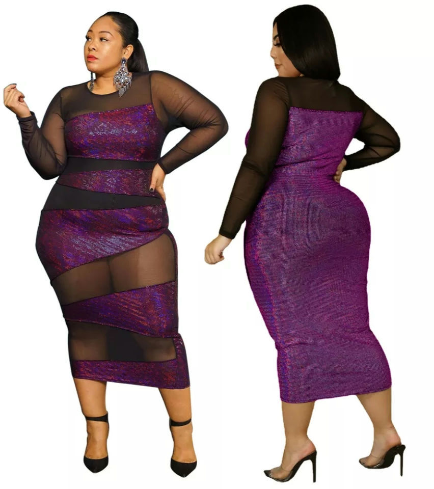 Sparkly Dress Plus Size Women See Through Mesh Patchwork Long Sleeves Sexy Party
